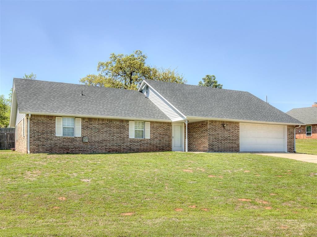 Enjoy the charm of small-town living within a short drive from Edmond and Oklahoma City. Situated on a .26 acre corner lot and just a short distance from the city park, this move-in ready home has been well cared for and offers both comfort and functionality. Inside, you'll find fresh interior paint, updated Pergo waterproof laminate flooring, and a spacious kitchen featuring solid oak cabinets, ample counter and cabinet space, a convenient breakfast bar, and a window above the sink overlooking the backyard. The refrigerator is included, making your move even easier. The oversized garage provides space for two vehicles plus an expansive additional area-perfect for a workshop, storage, or hobbies-and includes a utility sink and insulated garage door. The extended driveway offers extra parking with room to park an RV or boat. The current owner loves the quiet neighborhood, friendly neighbors, and energy efficiency of the home, noting consistently reasonable utility bills. Additional updates include a roof replacement in 2021 and various touches throughout. This property combines space, updates, and small-town charm-ready for its next owner to call home.