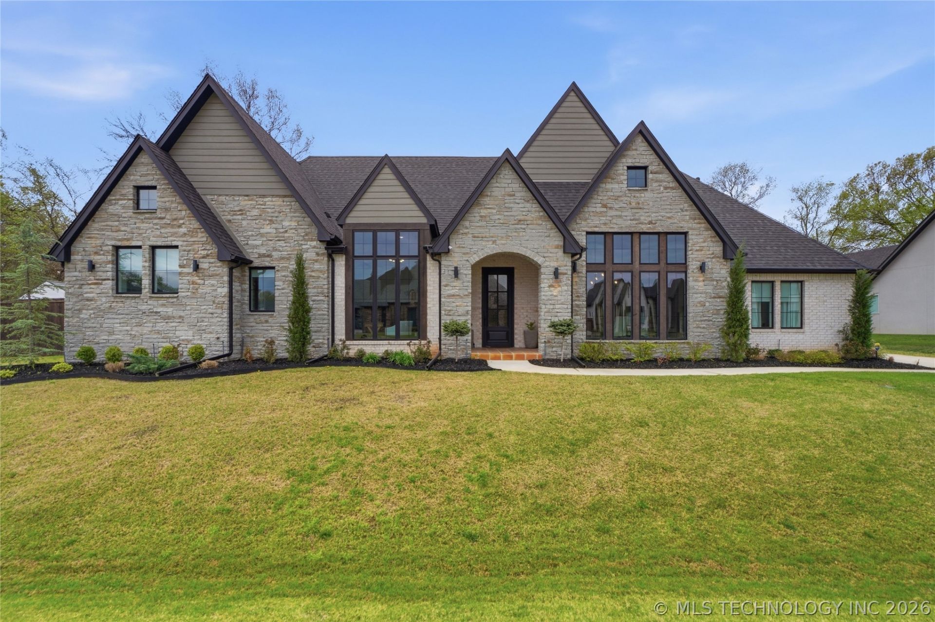 Not your average Jenks home! This former parade showcase property was built to impress, offering a rare combination of space, style, and a backyard made for staying in. Situated on a spacious half-acre lot in the exclusive gated community of Stone Creek, this one-of-a-kind property offers 4 bedrooms, 4 full baths, and 2 half baths, thoughtfully designed with both comfort and sophistication in mind. From the moment you step inside, you'll be captivated by the abundance of natural light, soaring ceilings, and designer finishes throughout. The home features gorgeous 7-inch white oak flooring on the 1st & 2nd floors, a dramatic floor-to-ceiling stone fireplace, and a seamless flow perfect for both everyday living and entertaining. Each bedroom offers its own private bathroom, creating a true retreat for family and guests alike. The kitchen boasts quartz countertops and high-end finishes, blending style and functionality. Step outside to your climate controlled, reverse osmosis pool with an integrated hot tub built to be enjoyed year-round. This property is like having your own private resort complete with an outdoor fireplace, kitchen, rock garden, fountain, and raised garden neighboring a serene wooded area and creek. The outdoor space is elevated with beautiful Saltillo tile & low-maintenance, artificial turf. Located in Jenks West just minutes from HWY 75 this home is both secluded & convenient.